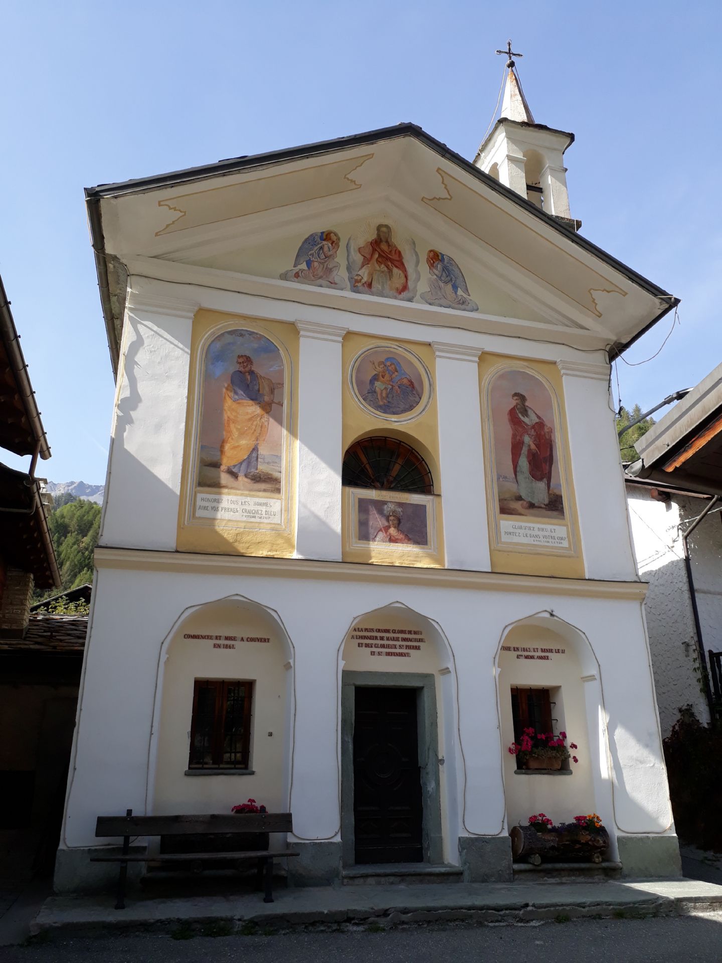 Situata nella località Periasc di Ayas, la cappella venne restaurata dal parroco Dandrès nel 1861, come si legge sulla facciata: “Commencee et mise a couvert en 1861 finie en 1863 et benie le 11 octobre meme annee”; sopra al portale è riportata la dedica “A la plus grande gloire de Dieu a l’honneur de l’immaculee et des glorieux S. Pierre et S. Defendent”.