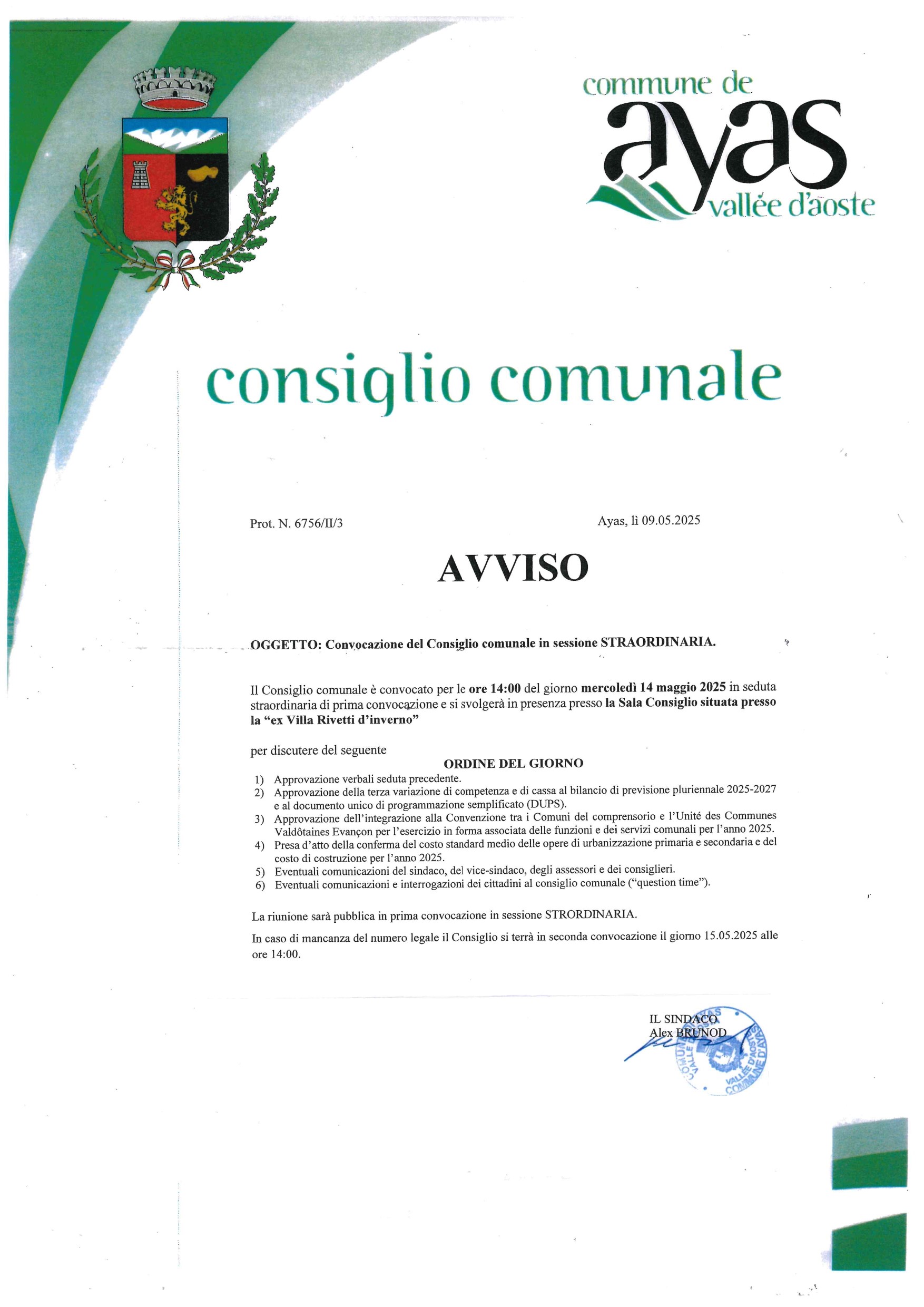 Il Consiglio comunale è convocato per le ore 14:00 del giorno MERCOLEDI' 14 APRILE 2025 in seduta straordinaria di prima convocazione e si svolgerà in presenza presso la Sala Consiglio situata presso la "ex Villa Rivetti d'inverno".