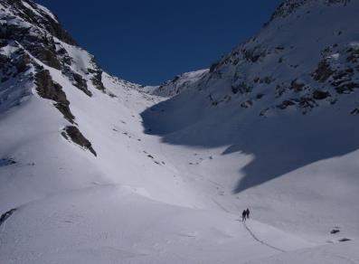 In caso di neve scarsa è possibile raggiungere lo stesso punto tenendosi nel fondo del vallone lungo il torrente.